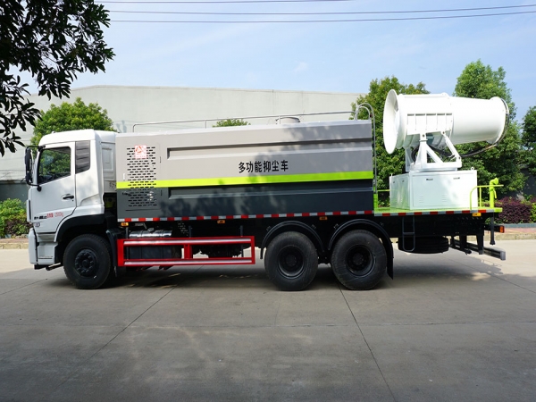 2.抑塵裝置采用國內(nèi)知名品牌,成霧量大、粒徑范圍大。霧炮噴射距離遠,且能實現(xiàn)俯仰角度可調(diào),滿足不同噴射距離工況的需求。使用副發(fā)動機驅動,傳動效率高。操作簡單,各功能通斷控制為電控氣動,一鍵切換,無需手動。